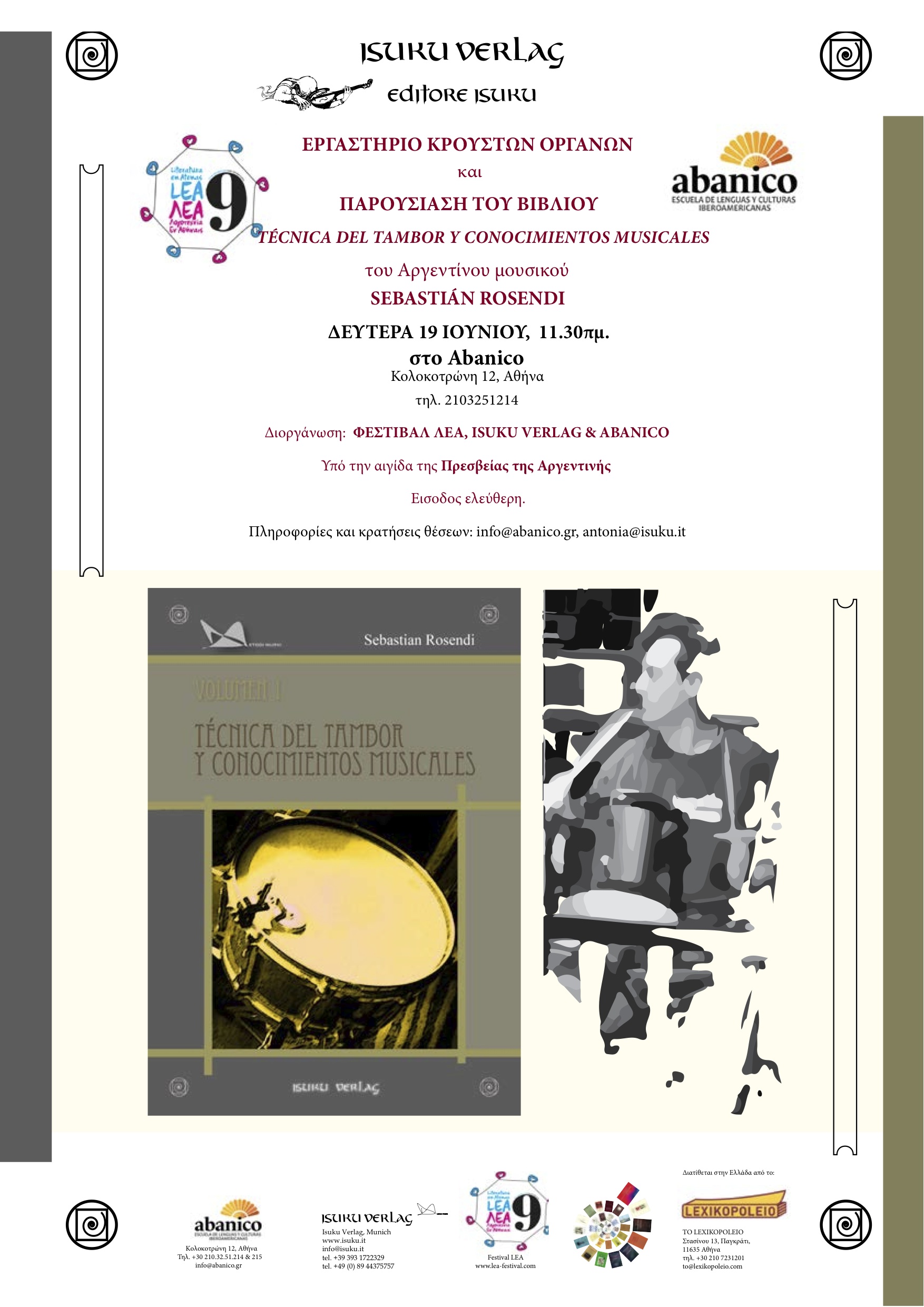 ΦΕΣΤΙΒΑΛ ΛΕΑ. Εργαστήρι κρουστών και παρουσίαση του βιβλίου "Técnica del Tambor'' στο κέντρο Ισπανικής και Πορτογαλλικής γλώσσας ABANICO με τον Sebastián Rosendi.